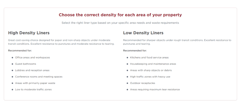 Density does not equal thickness. Each type of liner is designed for a specific use. High-density liners are typically thinner and lighter, making them cost-effective and resistant to odors and moisture. These bags work best in office or foodservice areas where waste is lighter, such as paper or food scraps.
